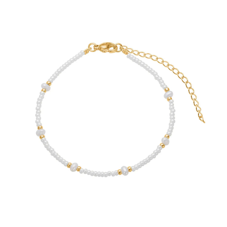 Et elegant armbånd i rustfrit stål belagt med 14 karat guld, pyntet med en smuk ferskvandskulturperle og små miyuki sten. Kombinationen af gyldne toner og farverige detaljer skaber et feminint og moderne udtryk, der passer perfekt til både hverdag og fest. Armbåndet måler 17 cm og har en 5 cm forlænger, så det kan tilpasses håndleddet.