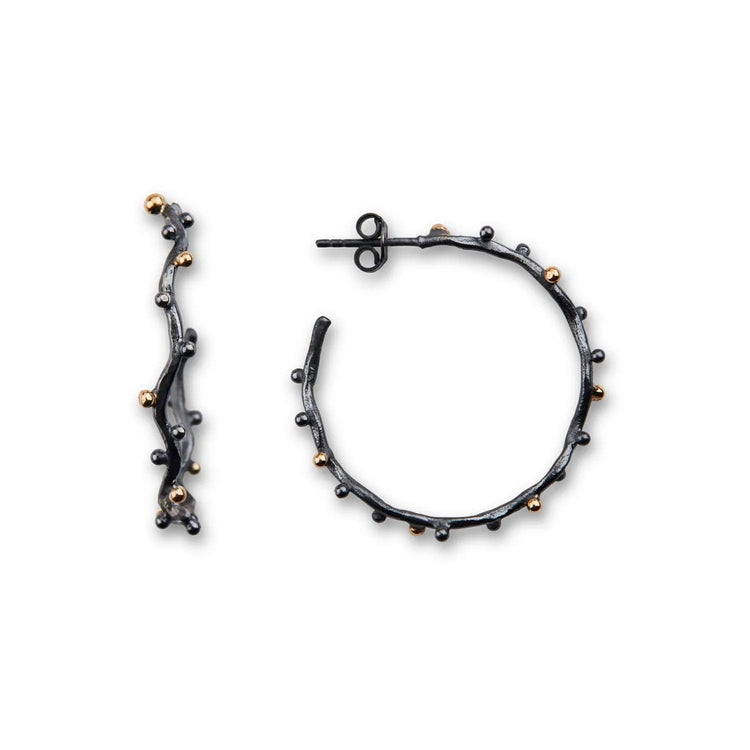 Et par håndsmedede creoler med et råt og eksklusivt udtryk. Grace Creol fra By Birdie er fremstillet i 925 Sterling sølv og 14 karat guld, og prydet med små guld- og sølvkugler, der skaber en levende og organisk struktur. Øreringene har en diameter på 30 mm og er en del af Windsor-kollektionen, som forener nordisk æstetik med kunstnerisk frihed. Den matte, mørke overflade og de bølgende former giver smykket en karakterfuld og tidløs elegance – perfekt til både hverdag og fest.
