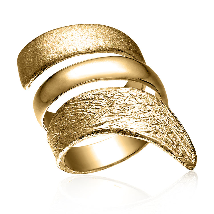 En unik og iøjnefaldende ring, der snor sig elegant om fingeren. Fremstillet i forgyldt sølv med rå overflader, hvilket giver et moderne og kunstnerisk udtryk. Ringen er bred og har en skulpturel form, der gør den til et statement-smykke – en ægte “must have” til dig, der ønsker noget særligt. Bemærk, at den brede form kræver ca. 2 numre større end en smal ring for optimal pasform.