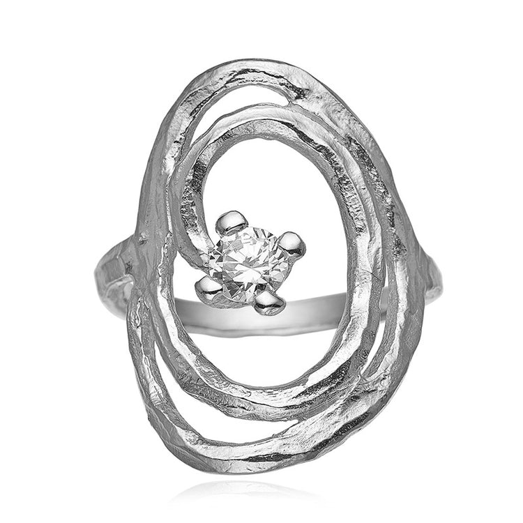 Rustik sølvring pyntet med hvid sten. Ringen ligger smukt over fingeren.