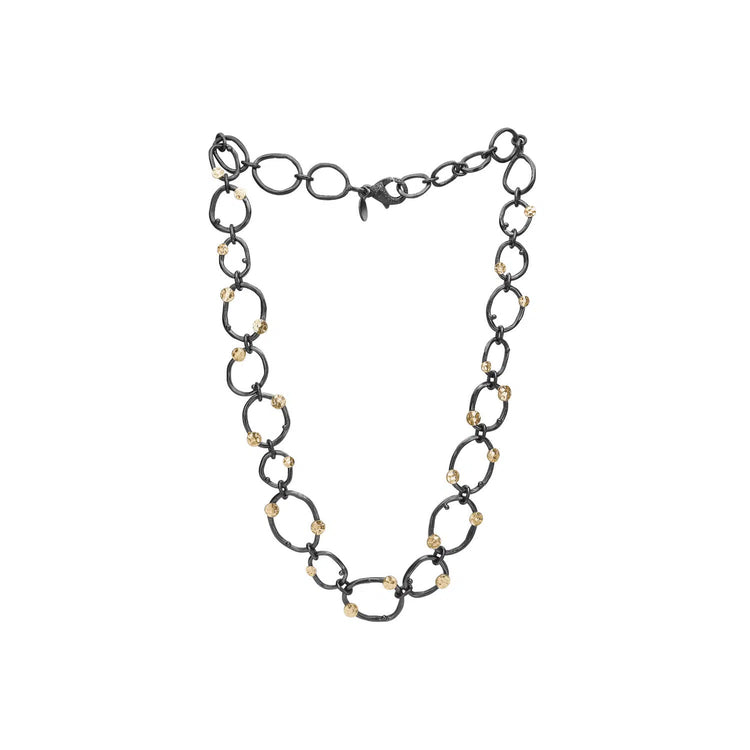 Orion Classic er en håndsmedet halskæde fra By Birdie, skabt med sans for detaljer og rå elegance. Halskæden består af kraftige lænker i oxyderet 925 sterling sølv, som giver et rustikt og karakterfuldt udtryk. De hamrede guldplader i 14kt. guld tilfører et eksklusivt og kunstnerisk præg, der gør smykket til noget helt særligt.