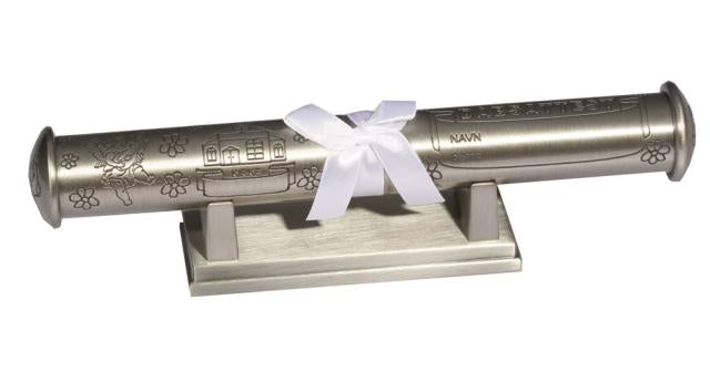 Enkelt og stilfuldt dåbsrør i fortinnet metal med fod, designet til opbevaring af barnets dåbsattest. Røret er dekoreret med smukke dåbsmotiver, en skytsengel og små blomster. I den spirituelle verden symboliserer skytsenglen beskyttelse og nærvær gennem hele livet. Dåbsrøret kan også indeholde personlige dokumenter som lykønskningskort og breve, og beskytter dåbsattesten mod krøller og buk. Gravering af navn, dåbsdato og kirke kan tilkøbes for at gøre gaven ekstra personlig. Bemærk: Ved tilkøb af gravering bortfalder fortrydelsesretten.