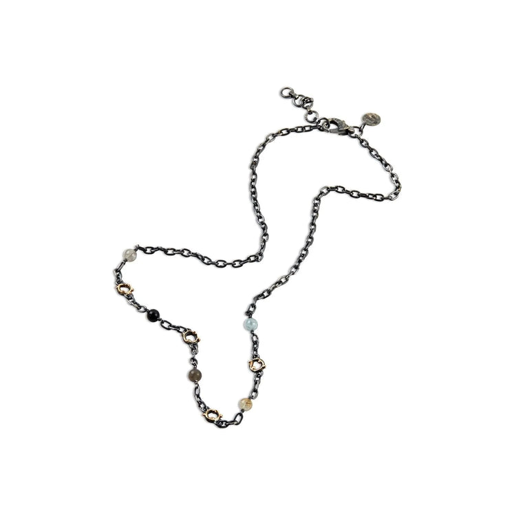 Zeus Stones Nature halskæden fra By Birdie er et håndlavet smykke, der kombinerer rå elegance med naturens farver og energi. Halskæden er sammensat af ægte sten – akvamarin, rutilkvarts, grå månesten, sort onyx og labradorit – sat i et harmonisk flow og afbrudt af små håndsmedede Zeus-led i oxyderet 925 sterling sølv. De naturlige nuancer og teksturer skaber et smykke med både ro og styrke.