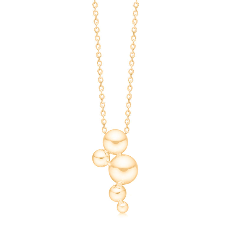 Et elegant og tidløst vedhæng fra Randers Sølv, hvor tre kugler i forskellig størrelse er samlet i en harmonisk klynge. Smykket er fremstillet i forgyldt 925 Sterling sølv og leveres med en matchende kæde, der fuldender det enkle og raffinerede udtryk. Kuglerne er halverede på bagsiden, så vedhænget ligger behageligt mod huden. Med en højde på 25 mm er det et smykke, der både kan bæres alene eller kombineres med andre for et personligt look.