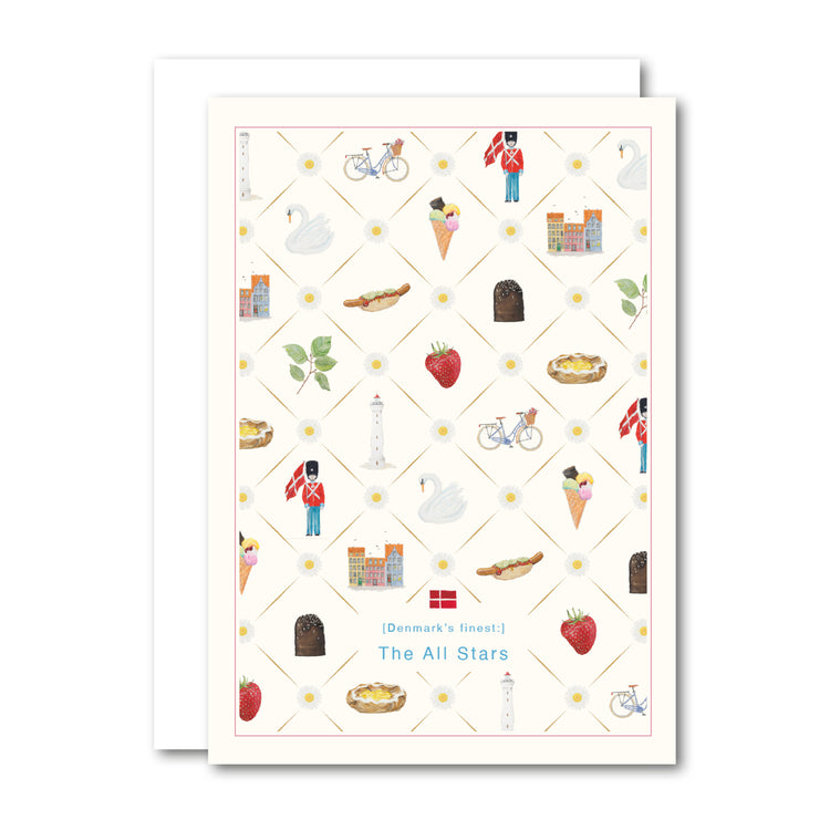 Kort i formatet A6 inkl. råhvid kuvert.Originaldesign med motivet; “The All Stars” af Annemette Voss Fridthjof.Danske motiver fra ‘Danish-serien’ på lys bund med teksten: “The All Stars".Kortet er trykt på postkortkarton, der gør det nemt at skrive på. Virkelig et smukt og unikt kort, der kan bruges som lykønskningskort sammen med gaver, som anledningskort med søde hilsner og lign.Designet med tryk af akvarel af håndmalede motiver fra serien: Danish.100% Dansk produceret.Et kort måler 105 x 148 mm.Kuverten måler 163 mm x 115 mm.Pakket i OPP-cellofanpose.