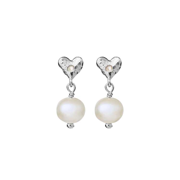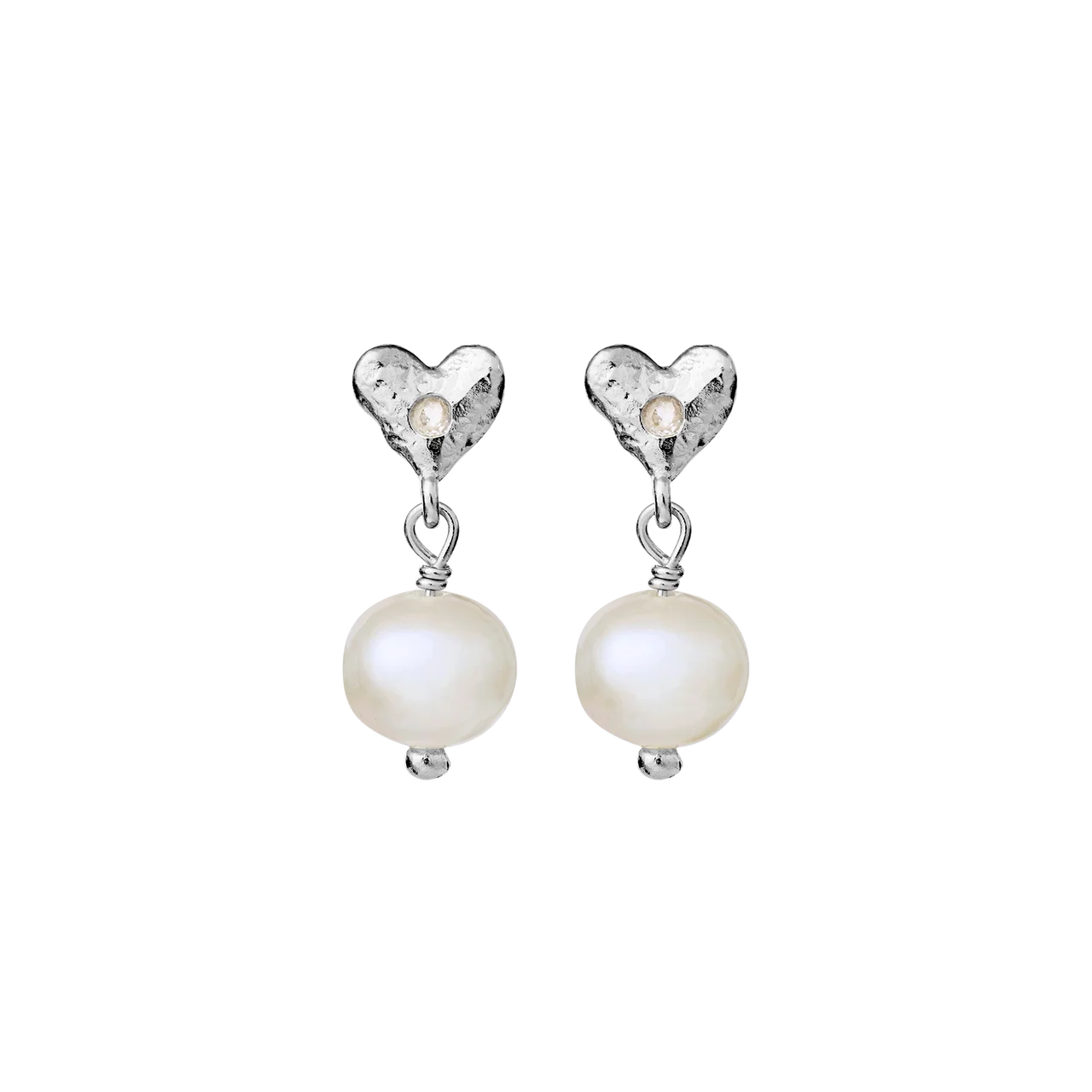 Maanestens Alia Øreringe er den ultimative forankring af hverdagskærlighed. De organisk formede hjerter med regnbue månesten i centrum og en dryppende ferskvandsperle skaber et poetisk og drømmende udtryk. Smykket er en hyldest til følelsernes styrke og det smukke i at bære kærligheden tæt på kroppen.