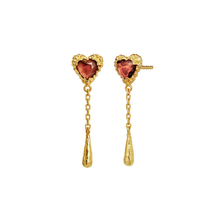 Kærligheden flyder fra Maanestens Lady forgyldte Øreringe, dryppende som gyldne tårer fra pink granat hjerter. Smykket symboliserer den kærlighed, vi alle er omgivet af – både den stille og den stormfulde. Det kunstneriske formsprog og den håndlavede finish gør øreringene til en følelsesladet og elegant tilføjelse til din smykkesamling.