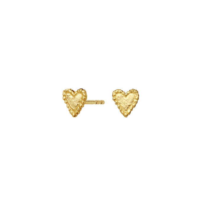 Maanestens Rouge forgyldte Øreringe indfanger kærlighed i dens mest livlige form. De omkransede gyldne hjerter flyder over med hengivenhed og udstråler varme og nærvær. Det organiske formsprog og den håndlavede finish gør øreringene til et poetisk og personligt smykke, der hylder kærlighedens kraft.