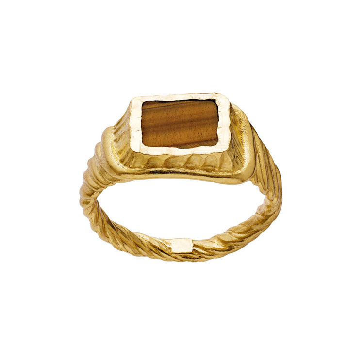 Kim ring forgyldt Maanesten - Kim er en signetring, der udstråler en stærk kraft fra sit indrammede tigerøje. Det siges, at tigerøje øger dit fokus og skarpsindighed, så du kan opnå det, du sætter dig for.