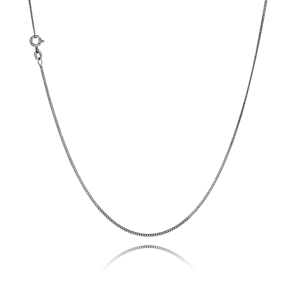 Elegant og moderne panser facet halskæde i sort rhodineret sterling sølv med en trådtykkelse på 0,40 mm. Den mørke rhodinering giver et eksklusivt og råt udtryk, mens den facetslebne overflade fanger lyset og tilføjer glans. Halskæden er udstyret med fjederringlås og fås i længder fra 38 til 80 cm – perfekt til vedhæng eller som enkel kæde.
