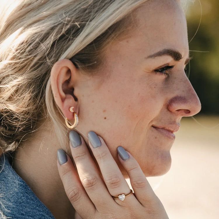 Øreringene er en del af Alita-kollektionen, inspireret af kærlighed og stærke bånd. De måler 16 mm og er dekoreret med fine sten fortil, der tilfører et smukt og feminint blikfang.