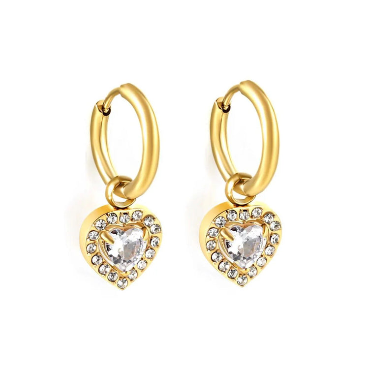 Disse øreringe er designet med en fin hjerteform og udsmykket med smukke sten, der giver et eksklusivt og feminint udtryk. Fremstillet i stainless steel med 18K PVD guldbelægning, er de både holdbare og vandfaste, hvilket gør dem perfekte til enhver lejlighed.