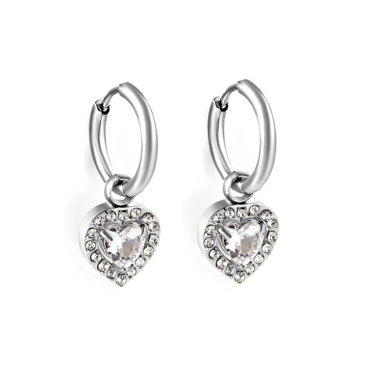 Øreringene er designet med en fin hjerteform og udsmykket med smukke sten, der tilfører et eksklusivt og feminint udtryk. Fremstillet i stainless steel med PVD-belægning, hvilket gør dem både holdbare og vandfaste – perfekte til enhver lejlighed.