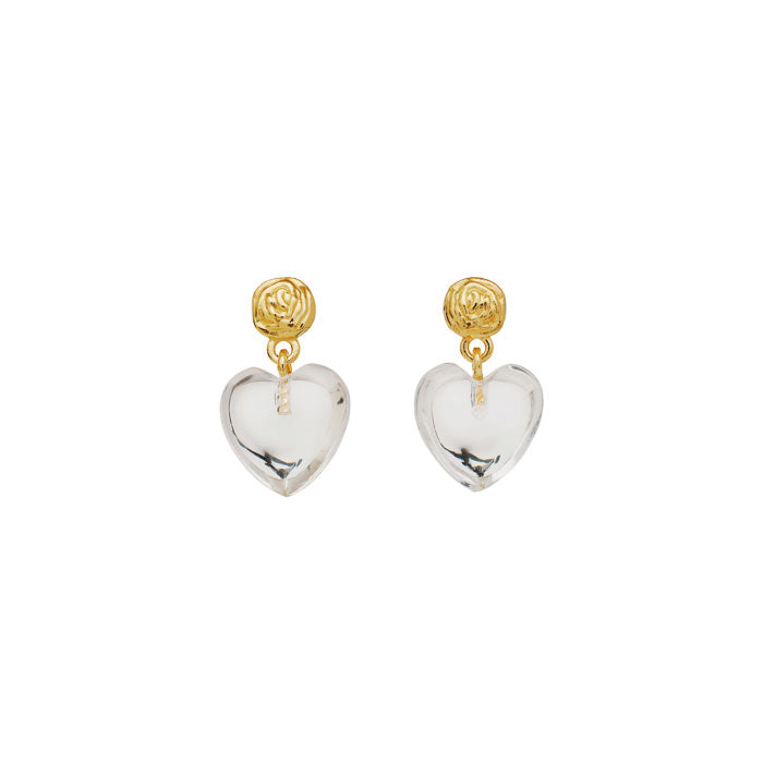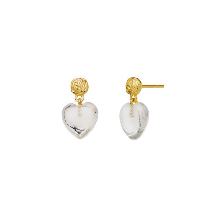 De elegante Lemona Petite Øreringe i Forgyldt Sølv fra Maanesten kombinerer et fint hjerteformet krystalvedhæng med en stilren rose. Med deres subtile 15 mm diameter tilfører de et romantisk og livsbekræftende touch til ethvert look.