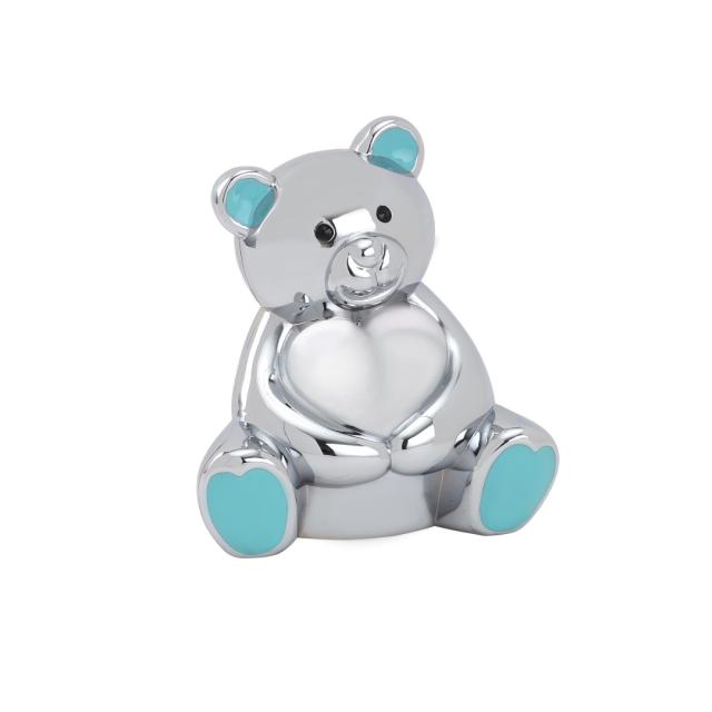 Fin forkromet sparebøsse bamse med lyseblå ører - Evt. gravering bestilles særskilt