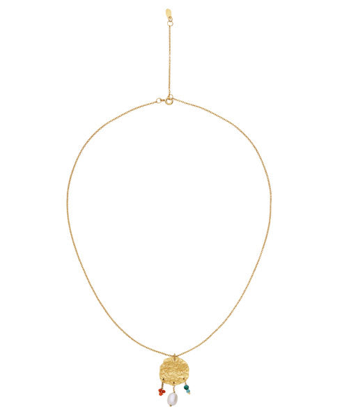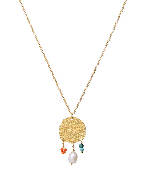 Skøn Henny Halskæde i forgyldt sølv fra Maanesten - Henny er en amulet fyldt med gode energier. Det smukke vedhæng med den store ferskvandsper-le, koraller og en turkis giver associationer til solen.