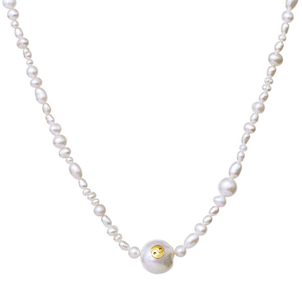 Lækker Maggie Halskæde forgyldt fra Maanesten - Maggie er den smukkeste perlekæde. Den er skab af ferskvandsperler i forskellige størrelser og har et balancerende Yin & Yang symbol på den store perle i midten.