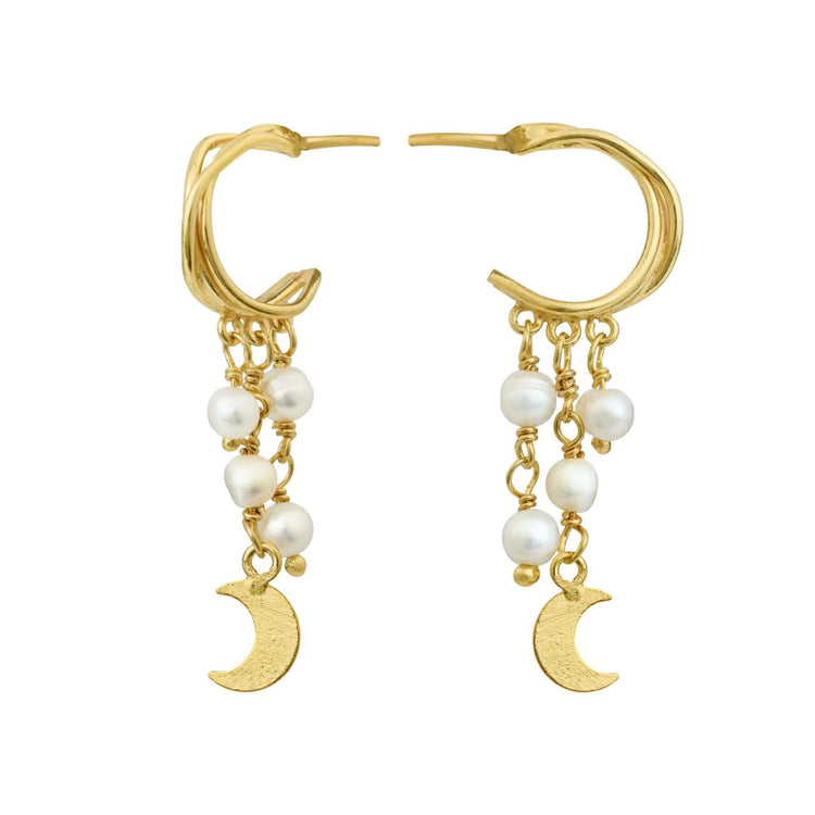 Ørebøjle, forgyldt sølv, 10 mm snoet løs tråd, hvide ferskvandsperler og måne ca. 3,5 cm