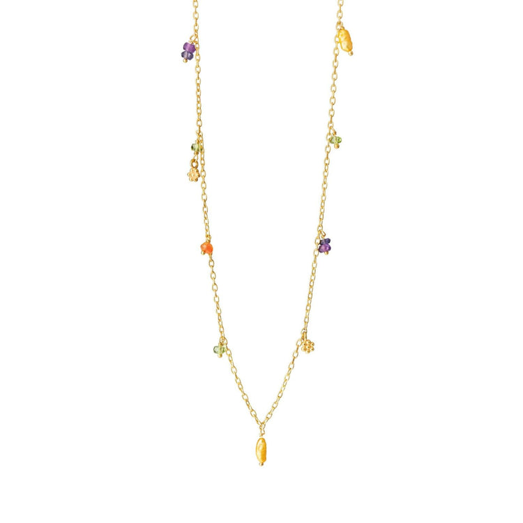 Halskædeanker 40-45 cm, forgyldt sølv, små blomster, ametyst, iolit, karneol, peridot, farvet ferskvandsperle