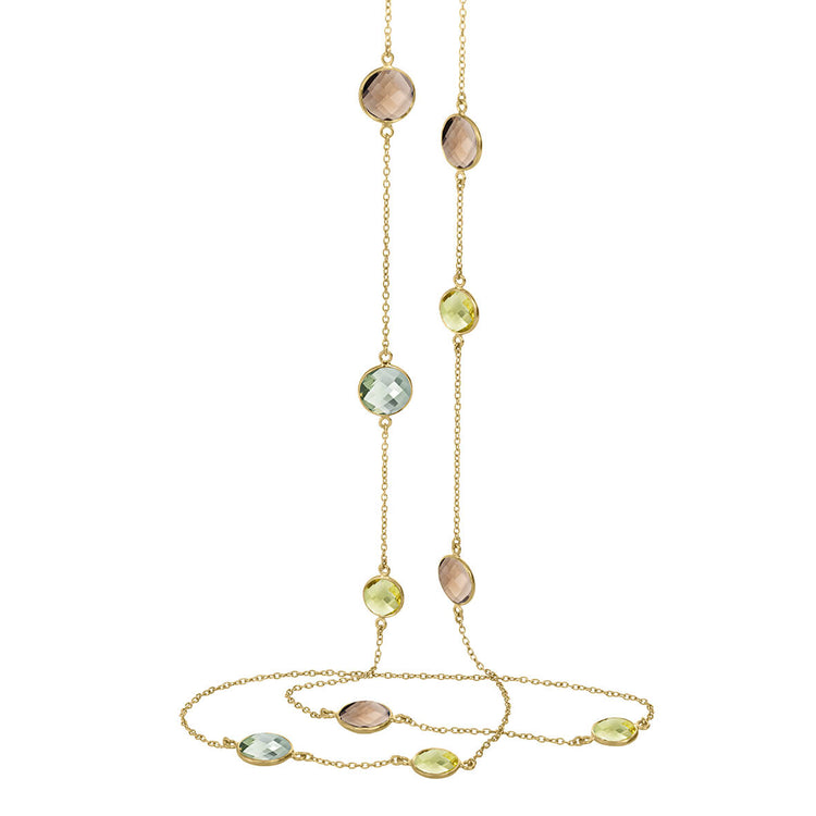 Halskædeanker 110 cm, forgyldt sølv, 10 og 12 mm facetgrøn kvarts, citronkvarts, røgkvarts Susanne Friis Bjørner