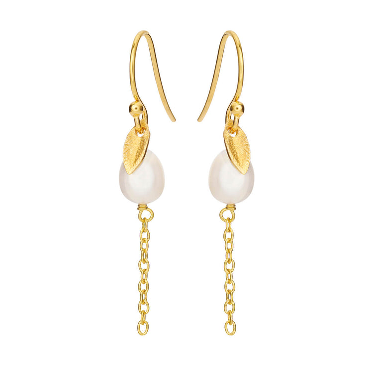 Ørering (krog), forgyldt sølv, lille blad og hvid ferskvandsperle 5-6 mm med kæde ca. 4 cm
