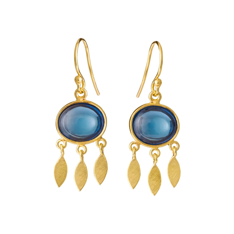 Ørering (krog), forgyldt sølv, London blå krystal oval cabochon 10×12 mm med små blade ca. 3,5 cm lang