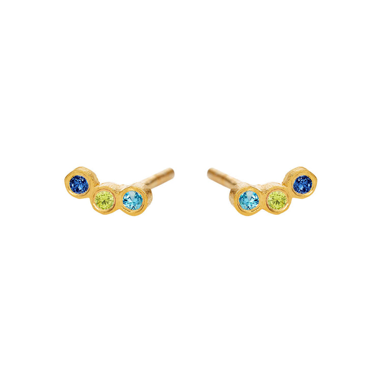 Forgyldte Ørestikker med 3 små zirkoner peridotgrøn lyseblå