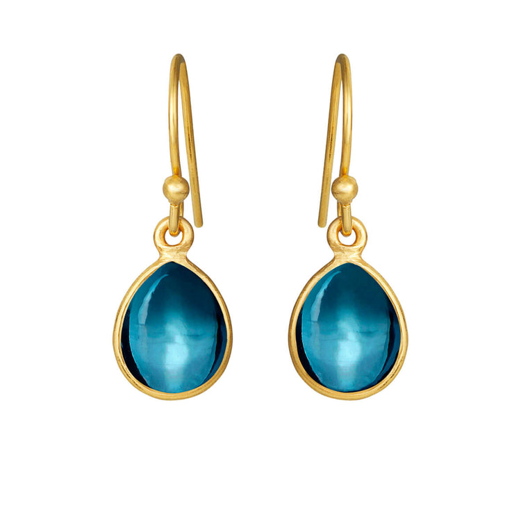 Forgyldt ørehænger med glitrende London blue crystal på elegant, tynd bøjle. Perfekt til at tilføre farve og finesse til ethvert outfit – fra hverdag til fest.