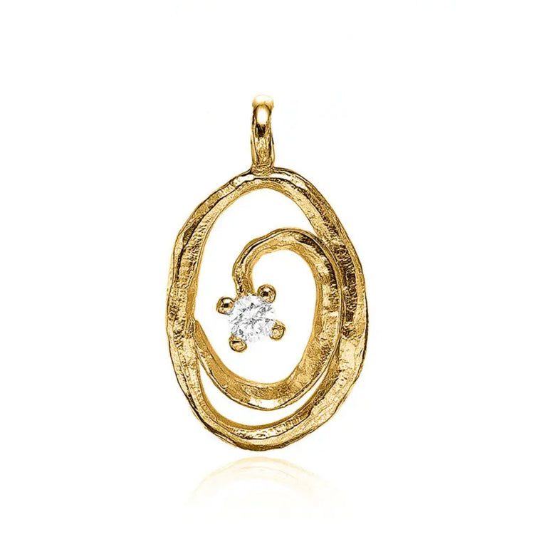 Et unikt og elegant halssmykke udformet som en spiral med en let skæv facon, der giver et råt og moderne udtryk. Smykket er fremstillet i forgyldt sølv og prydet med en smuk zirkonia, som tilfører et strejf af eksklusivitet. Perfekt til dig, der ønsker et vedhæng med karakter og stil. Leveres med justerbar ankerkæde 42-45-50cm
