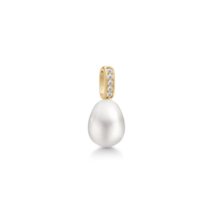 Klassisk og feminint vedhæng produceret i 22 karat forgyldt 925 sterlingsølv med en ferskvandsperle og klare kubiske zirkoner. Måler 15,3 x 7 mm