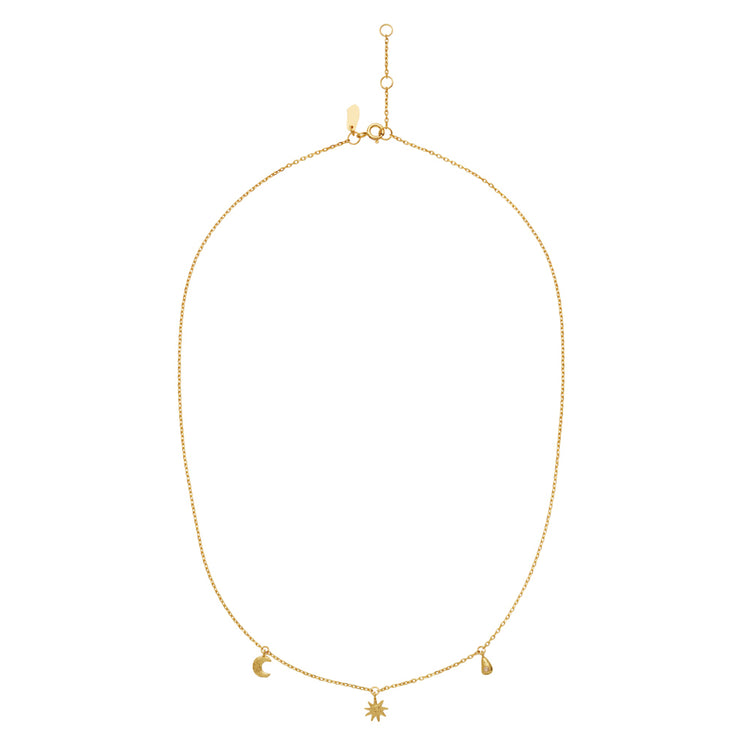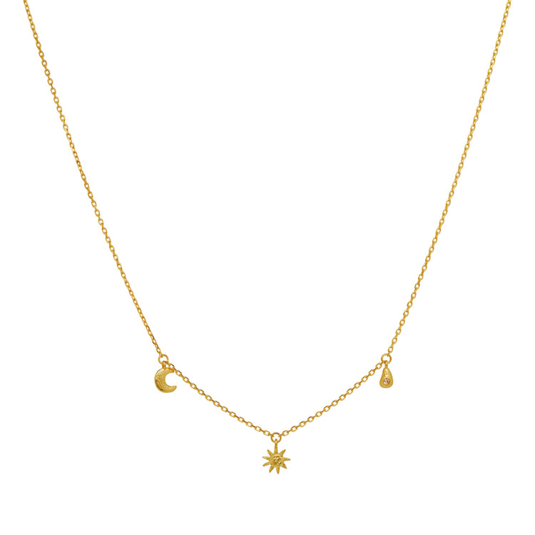 - Forgyldt halskæde med sol, måne og dråbe-symbolik