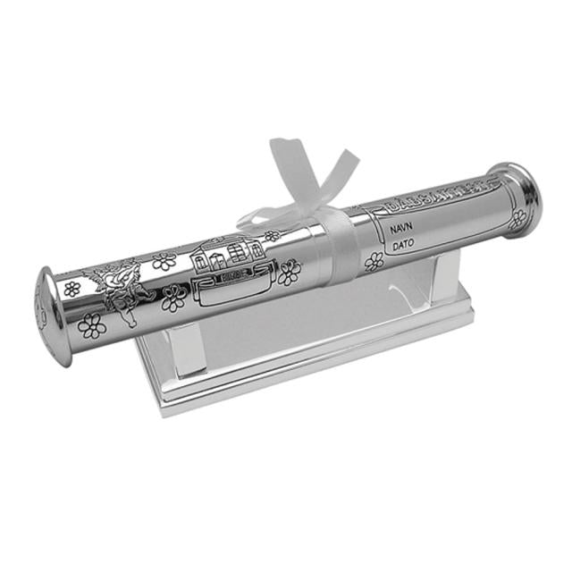 Et enkelt og stilfuldt dåbsrør i forkromet metal med fod, dekoreret med dåbsmotiver, små blomster og en skytsengel – et symbol på beskyttelse og nærvær gennem livet. Dåbsrøret er ideelt til opbevaring af barnets dåbsattest og andre personlige dokumenter som lykønskningskort og breve. Den klassiske tradition med dåbsrør gør gaven både praktisk og betydningsfuld. Gravering kan tilkøbes og placeres i de dertil egnede felter med navn og dåbsdato, hvilket gør gaven personlig og varig. Bemærk, at fortrydelsesretten frafalder ved tilkøb af gravering. 24cm bredde.