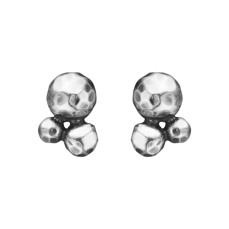 Små og karakterfulde ørestikkere inspireret af rosenknopper. Rose Buds Silver Cluster er håndlavet i 925 sterlingsølv og består af tre hammerslåede sølvkugler i forskellige størrelser. Overfladen er oxideret og derefter poleret, så der bevares en mørkere kontrast i mellemrummene, hvilket skaber et smukt spil og dybde i designet.