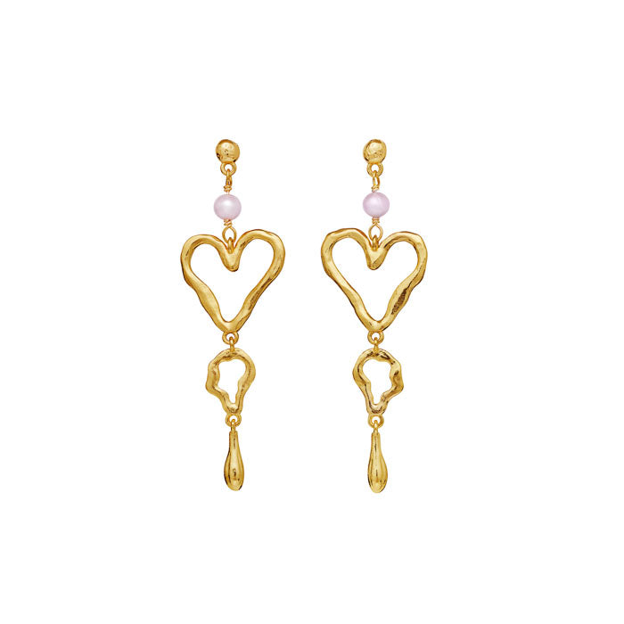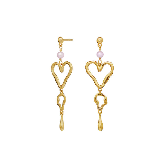 De elegante Sabrina øreringe fra Maanesten hylder kærlighedens gudinde Afrodite med et flydende, kaskadeformet design, der falder smukt fra øret. Hver ørering er udført i genanvendt sterlingsølv (925) belagt med 18 karat guld, hvilket giver et varmt og tidløst udtryk.