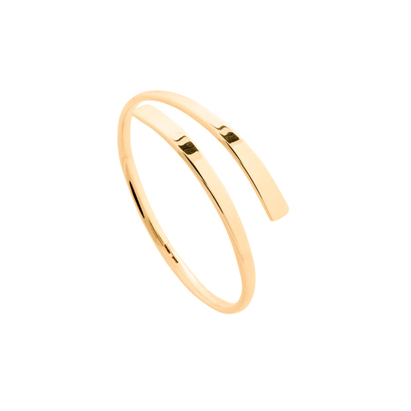 Et stilrent og moderne slangearmbånd fra Randers Sølv, udført i sterling sølv og belagt med 18kt. guld. Armbåndet har en oval trådprofil med en bredde på 3,8 mm og afsluttes med to flade ender, der giver et grafisk og elegant udtryk. Den glatte overflade og fleksible form gør armbåndet behageligt at bære, mens det skulpturelle design tilfører kant og karakter. Med en indvendig diameter på 65 mm passer det til de fleste håndled og kan bæres alene eller i kombination med andre smykker.