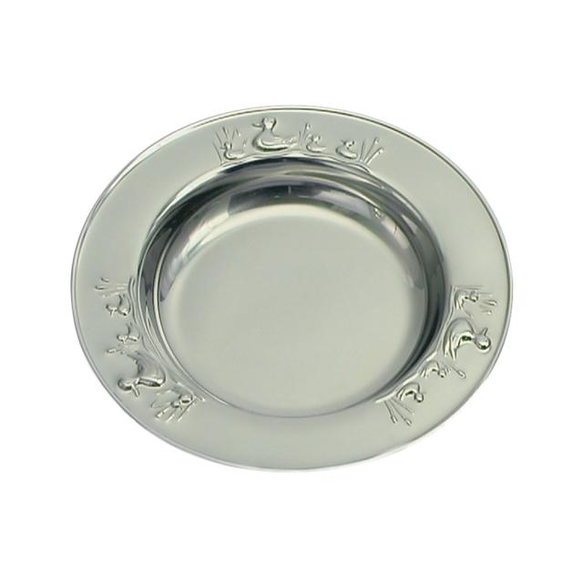 En klassisk og enkel dåbstallerken i rustfrit stål, dekoreret med de fineste motiver af små ænder, der svømmer efter andemor i andedammen. Et charmerende design, der gør tallerkenen velegnet som dåbsgave, barselsgave eller gave til navngivning.